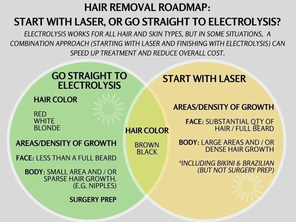 If you have significant unwanted facial hair (such as for some trans folks), starting with laser may be the best strategy, to reduce quantity, density and coarseness before finishing clearance with electrolysis— a combination approach could potentially save significant time and money.
